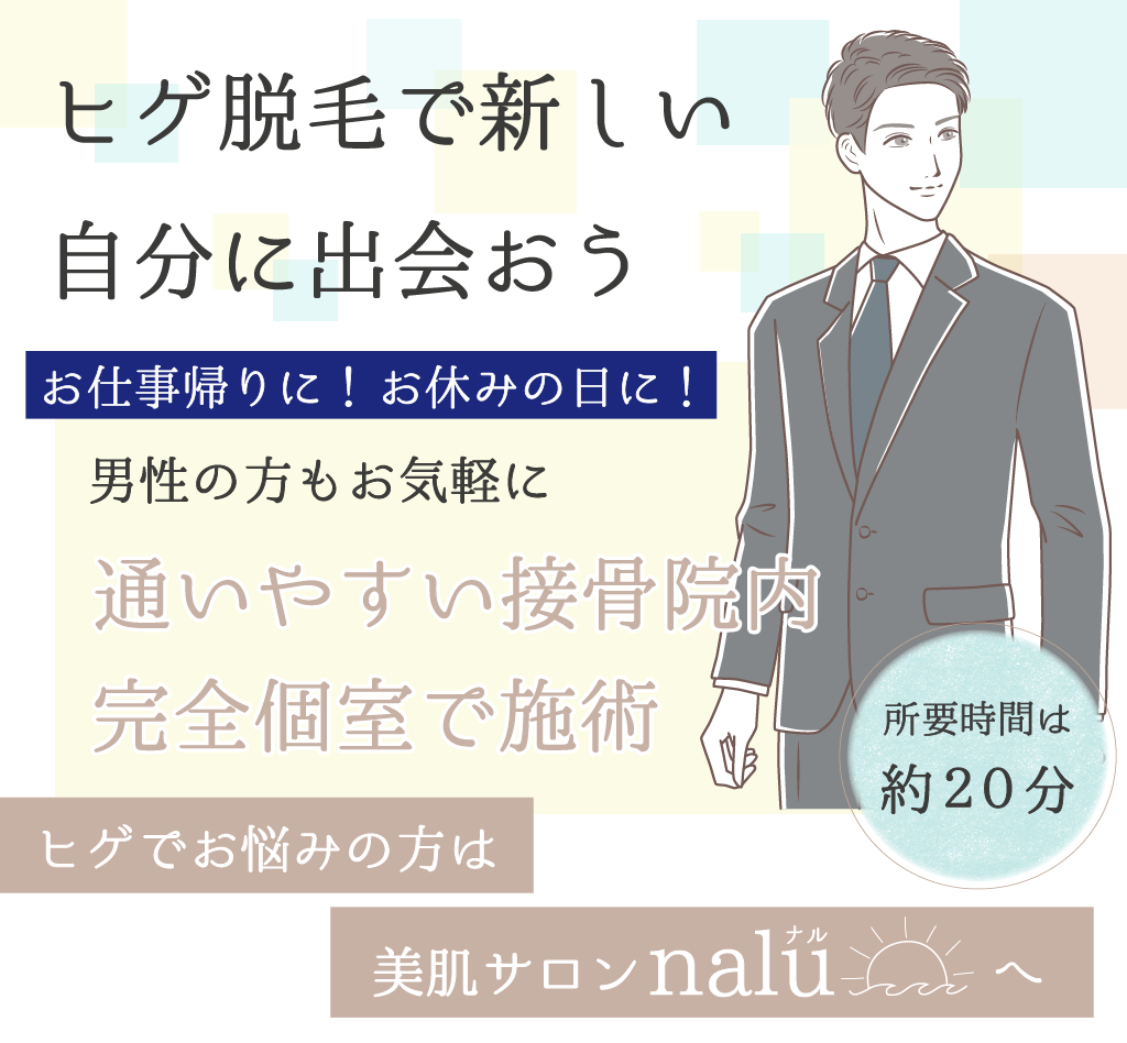 アゴヒゲやほほといった部分的なヒゲ脱毛はすごく安いと感じ、ヒゲ全体を契約したら思った以上に高くなった!というお話やご経験はありませんか? naluは複雑で分かりにくい料金システムは一切導入しておりません。 都度払いOK! 明朗会計で分かりやすい価格なので、知らない間に追加料金が発生していた!高額のコースを契約してしまった…という心配もございません。